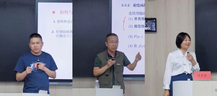 李承家、韩敬伟、杨苏敏三位主讲嘉宾依次做专题分享。李老师结合《概率论与数理统计》课程的教学经验和多年督导工作经验,从PPT的设计使用、智慧工具的使用、课堂教学的适时中断、课堂有效互动等方面分享了如何上好一门课。韩敬伟老师从好课堂的标准出发,以《线性代数》三阶行列式的展开式为例,探讨如何与学生进行生动、有趣、高效地互动。杨素敏老师结合《高等数学》教学情况,立足于课程定位和学情分析,从教学目标、教学过程、课程思政、师生互动与激励、教学评价等维度分享了如何进行有效的教学设计与实施。