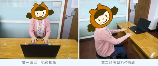 1.准备面试双机位。需要两部带摄像头的设备以及可进行通话的麦克风、音响等设备,电脑、手机均可。第一机位为面试主机位,面向考生,用于考官对考生的远程网络面试(建议首选电脑+有线宽带或稳定流畅的WIFI)。第二机位为面试副机位(监考机位,建议使用智能手机+4G/5G网络或稳定流畅的WIFI),放于考生侧后方45度,用于考官和视频监考员在面试过程中观测考生的后方及周边环境情况。双机位如机位摆放图例所示。