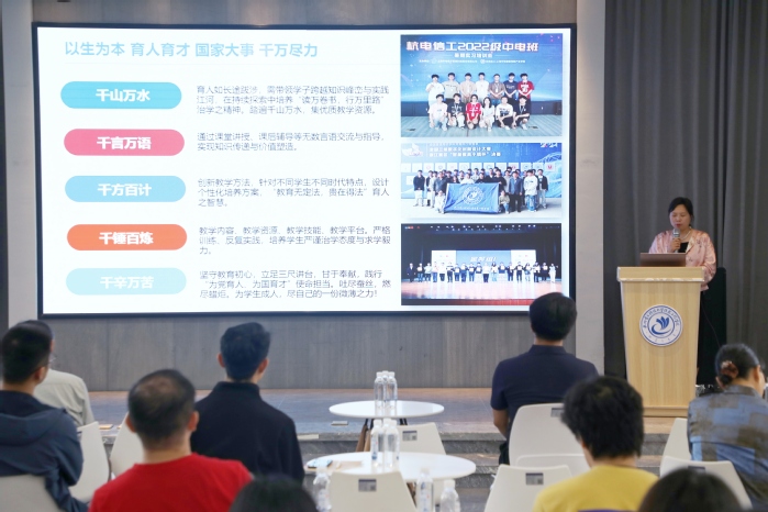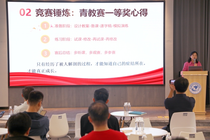 主题分享环节,《一次挑战与成长的旅程》为题,从自身教学能力提升、竞赛历练以及科研能力培养三方面,分享教学经验与参赛心得。她指出,讲好课需在实践与反思中打磨,教学竞赛是优化课程的契机,从课程构思到课堂呈现,都应追求极致。