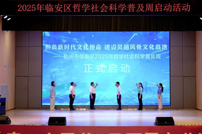 随后,沈向荣、叶岩明、张馨艺、张发平、邵萱郑然、董晔一同按下启动键,开启临安区 2025 年哲学社会科学普及周的序幕。