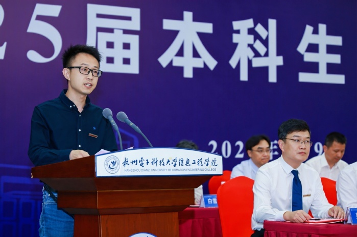 教师代表张海平老师向全体毕业生表达了热烈的祝贺,并深情寄语大家坚守踏入信息工程领域的初心,在未来的广阔天地中持续学习、迭代更新、勇敢担当,如同精心编写的代码稳健运行于社会,创造价值,成就自我。