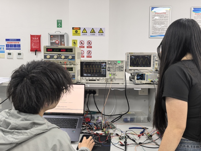 实训基地内,备赛师生围坐实验台激烈研讨,代码在屏幕间滚动,创意在热浪中打磨成形。全力备战时,他们力争以实力为学院争光。