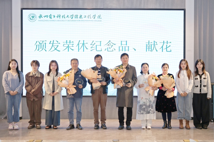 热烈的掌声中,五位荣休教师代表登台,王艳、管力明为他们颁发纪念品,青年教师代表献上鲜花。这份精心准备的荣休之礼,不仅承载着学院对老师们数十载耕耘的崇高敬意,也象征着信工精神的薪火相传。