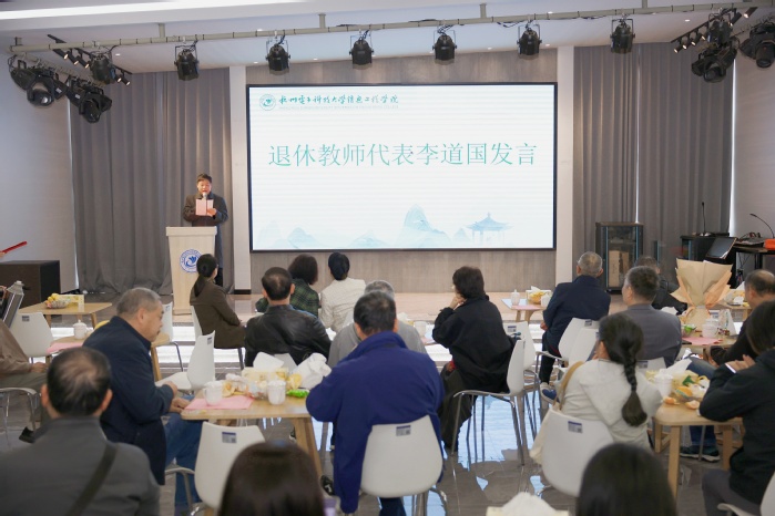 钱波代表学校党委、学院董事会,向荣休教师致以诚挚感谢与问候。她高度评价信工近年来取得的显著发展成就,并深情回忆与老教师们共事的点滴。钱波指出,一代代信工人以智慧和奉献为学院发展筑牢坚实根基,这份精神的传承与延续,已然成为信工最宝贵的财富。她希望离退休教职工们退岗不褪色、离岗不离心,以“引路人”身份积极分享教学经验,助力青年教师成长,为学院发展建言献策。她郑重表示,杭电与信工将持续强化服务保障,用心用情为离退休教职工办实事、解难题,确保温暖常伴大家左右。